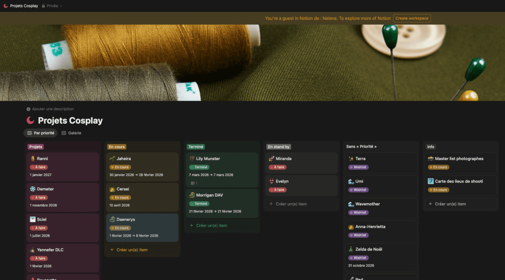 Tout le reste est customisable et pour ma part en premier lieu je vais mettre ma fiche éléments et quelques images de références pertinentes (la majorité de mes images de références restent dans mon dossier sur mon disque dur). Puis je vais faire 3 listes : ma liste de courses, ma liste de tâches sur le costume, ma liste de tâches « média ». J’utilise la to-do list avec cases à cocher directement proposée par Notion. J’adore le moment où je peux cocher la case d’une étape terminée, c’est très satisfaisant !