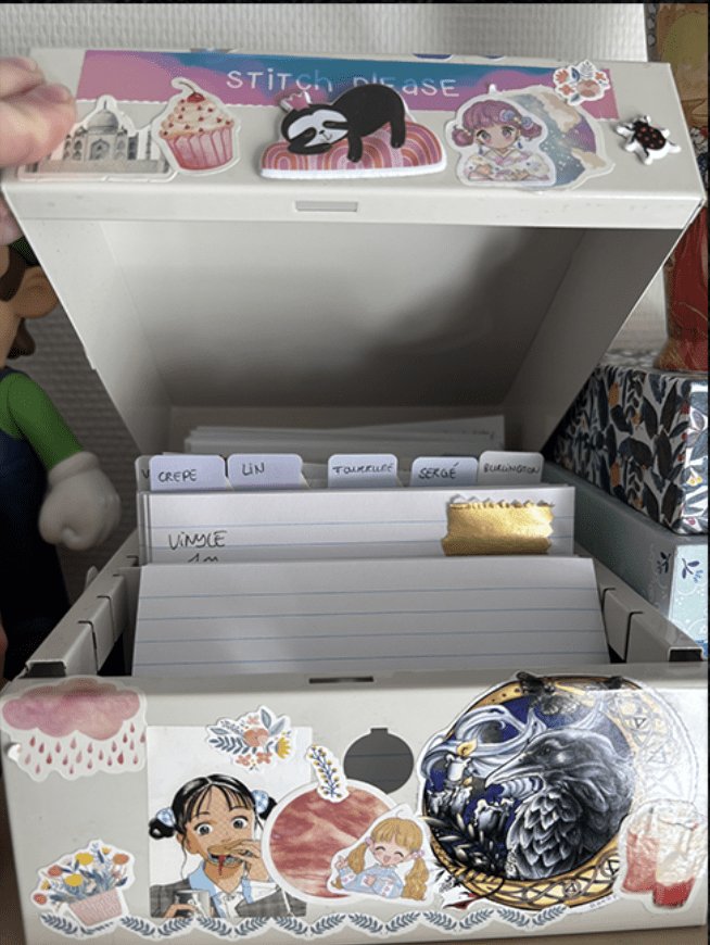 A partir de là, je vérifie si je ne dispose pas déjà de certains éléments dans mon stock de matériel. Pour m’aider, notamment pour les tissus, je me suis fait de bonnes vieilles fiches bristol classées dans une boîte que j’ai récupérée à un de mes jobs alors qu’elle était vouée à la poubelle. Sur chaque fiche, je colle un petit échantillon de quelques centimètres carrés de tissu, puis je note le métrage dont je dispose. Lorsque j’utilise un morceau de tissu, je mets la fiche concernée à jour. Je classe ensuite mes fiches par matières. Ce petit classeur est vraiment super pratique car avec les années, j’ai accumulé de plus en plus de choses et parfois, je ne me souviens plus de ce que j’ai déjà.
