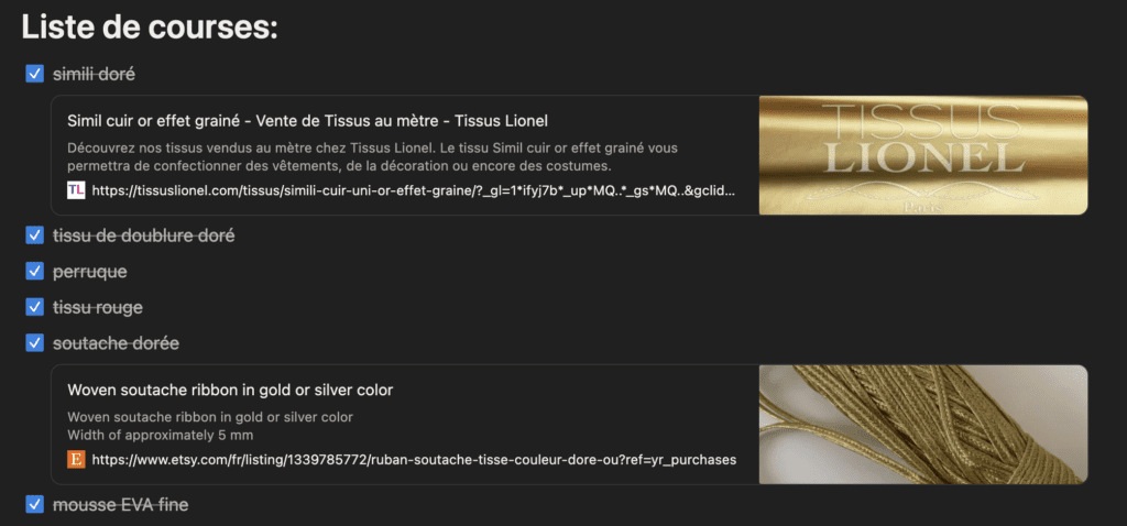 Pour la liste de courses, j’y insère aussi les liens des boutiques en lignes où j’ai repéré des articles qui conviendraient à mon projet.