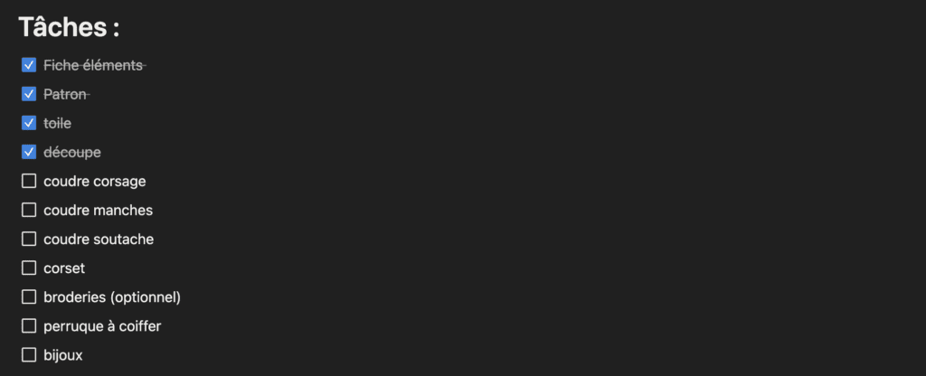 Pour la liste de tâches costume, je découpe simplement mes tâches par étapes, les premières sont toujours les mêmes : faire la fiche éléments, faire le parton, faire une toile (je ne la fais pas toujours je l’avoue), et couper mon tissu. Le reste est ensuite propre à chaque projet :