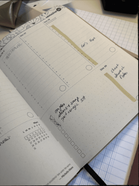 A partir de ma date de rendu (pas forcément précise, il me faut au moins un mois ou un trimestre), je passe à la planification de mes tâches. Pour cela j’utilise mon agenda papier (je sais que Notion propose aussi un calendrier, mais à ce niveau là, je suis un peu vieux jeu !). Depuis quelques années, je suis une adepte des agendas de My365, super pratiques et jolis.