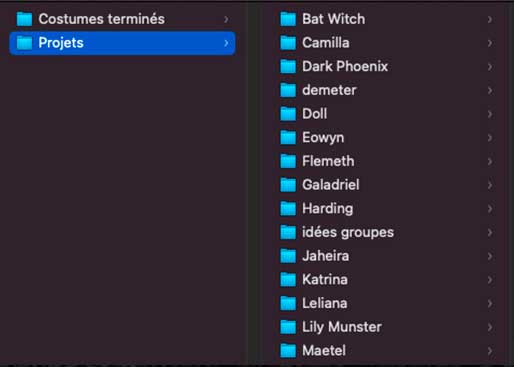 - Projets : Je fais un tri dans mes dossiers d’images de références du point précédent, et les projets que je mets ici sont ceux qui sont passés de « Wishlist » à une vraie envie de commencer le costume.